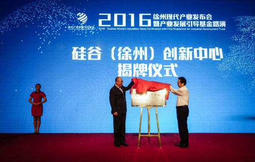 7月12日,与会嘉宾在大会现场为硅谷(徐州)创新中心揭牌。当日,2016徐州现代产业发布会暨产业发展引导基金路演在江苏徐州正式开幕。大会吸引青云创投、北极光创投、纪源资本等几十家国内知名投资机构的创始人、合伙人以及百余名投资界精英齐聚一堂,共同为徐州的产业转型升级献计献策。新华社记者李响摄